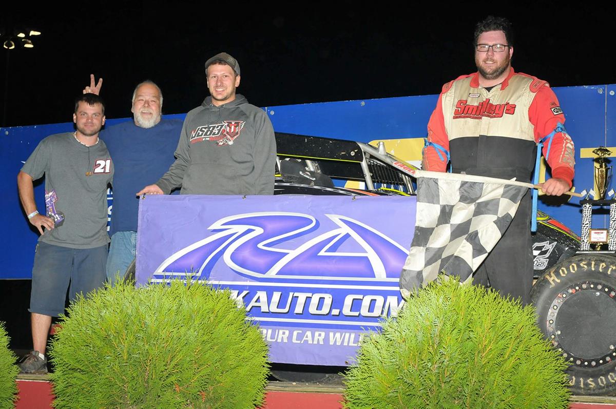 A Feature 1 (25 Laps): 1. 87-Mike Mueller, [2]; 2. 15E-Caley Emerson, [4]; 3. 7-Scott Brandt, [6]; 4. 16-Anna Hippe, [1]; 5. 6-Jake Kouba, [3]; 6. 3K-Jeremy Kerzman, [7]; 7. 55-Joseph Kouba, [8]; 8. 99-Bryan Roach, [10]; 9. 2K-Jimmy Kouba, [15]; 10. 1-Tony Norem, [13]; 11. 48-Neal Matuska, [12]; 12. 33C-Cody Emmans, [11]; 13. (DNF) 12-Johnny Parsons III, [5]; 14. (DNF) 90-Tony Klose, [14]; 15. (DNF) 69S-Jon Lewerer, [9]